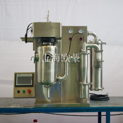 經過前道工序處理后的料液利用蠕動泵送至干燥室上方的霧化器,將料液均勻地霧化為極微米霧滴群,進入干燥室內,氣體進入加熱系統,被加熱至工藝所需的溫度,經熱風管道均勻進入干燥室,與霧滴群接觸后高溫固化,熱解成產品,干燥后的成品隨同尾氣經出風管送至旋風分離器進行氣固分離 ,成品回收,飽和尾氣經過除塵器濾芯過濾后進入OM-YJ-500型氮氣循環有機溶劑回收裝置的冷凝器進行溶劑回收,經過冷凝后的氮氣再次進入加熱器循環使用。